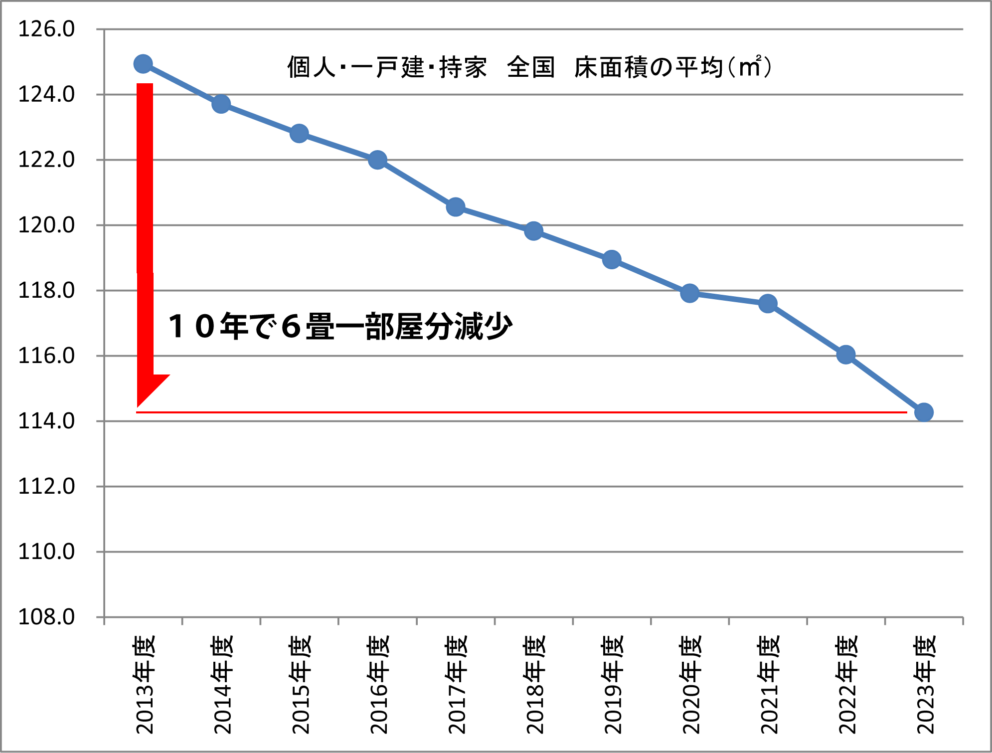 床面積の平均は、年々下がり続けています。2013年度は124.9㎡(37.8坪)、2023年度は114.3㎡(34.6坪)です。10年で3.2坪減りました。6畳一間が無くなった計算です。
