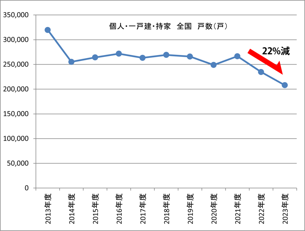 2014年度以降、約26万戸で推移してきましたが、2021年度は266,571戸でしたが、2022年度は234,724戸(前年度比-12%)、2023年度は208,029戸(前々年度比-22%)と2年連続の大幅下落になっています。