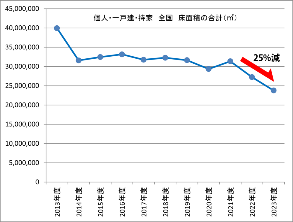 床面積の合計は、着工戸数に比例しています。2014年度以降、約3200万㎡で推移してきましたが、2022年度は2723万㎡、2023年度は2377万㎡(前々年度比-24%)と2年連続の大幅下落になっています