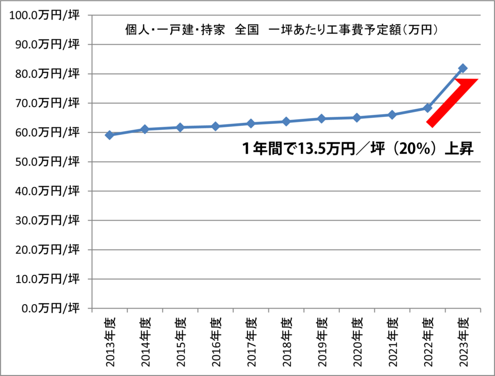 工事費予定額の急激な上昇は、坪単価でみるとより鮮明です。2022年度の坪単価が68.3万円/坪でしたが、2023年度は81.8万円/坪と、1年間で13.5万円/坪(20%)も上昇しています。