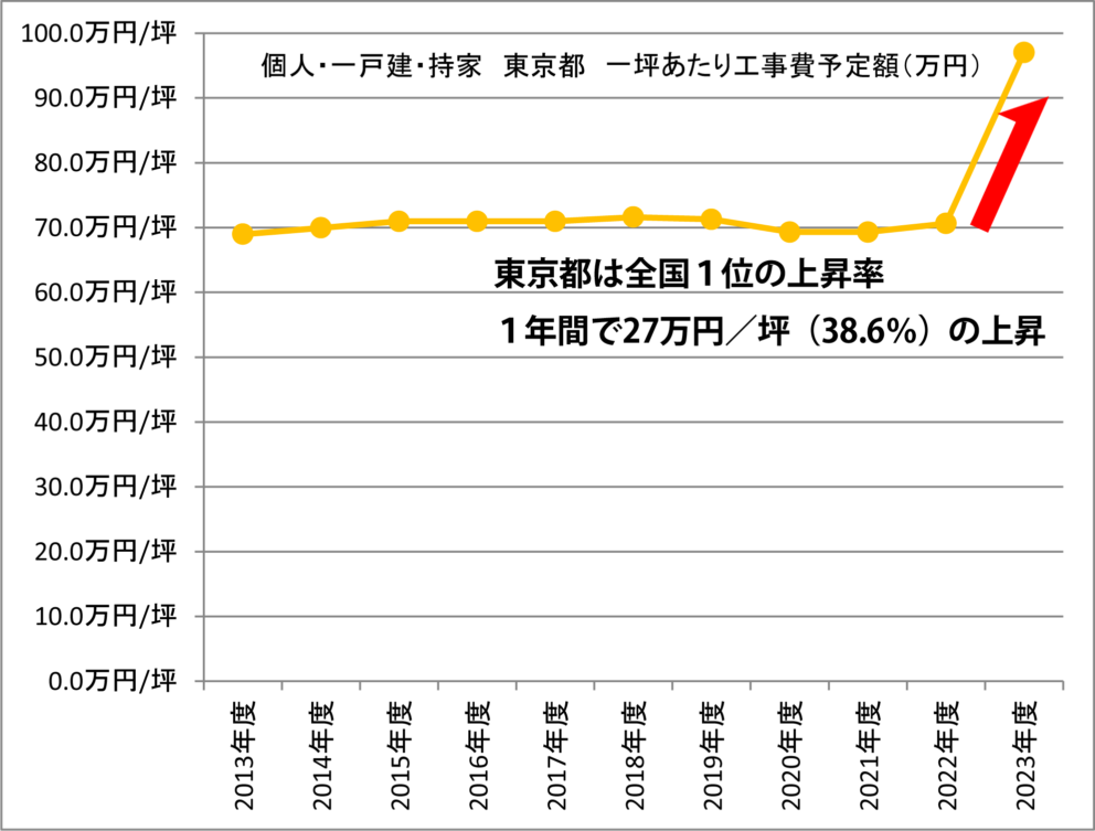 工事費予定額の急激な上昇は、東京都が最も大きいのです。過去10年間、坪単価が約70万円でしたが、2023年度は坪単価が約97万円です! 1年間で27万円/坪(38.6%)の上昇です。約4割も値上げになりますので、一戸建住宅の新築を諦める方が、続発しているのです。