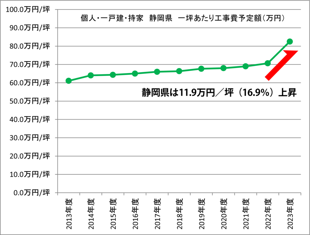 2023年度の一坪当たりの工事費予定額の全国平均は20%上昇です。静岡県の場合、2022年度70.6万円/坪でしたが、2023年度は82.5万円/坪と11.9万円/坪上昇しています。上昇率は16.9%になりますので、全国平均から比べると、やや穏やかです。2024年度は、首都圏における職人不足の影響が静岡県に及びますので、2024年度の上昇は覚悟する必要がありそうです。