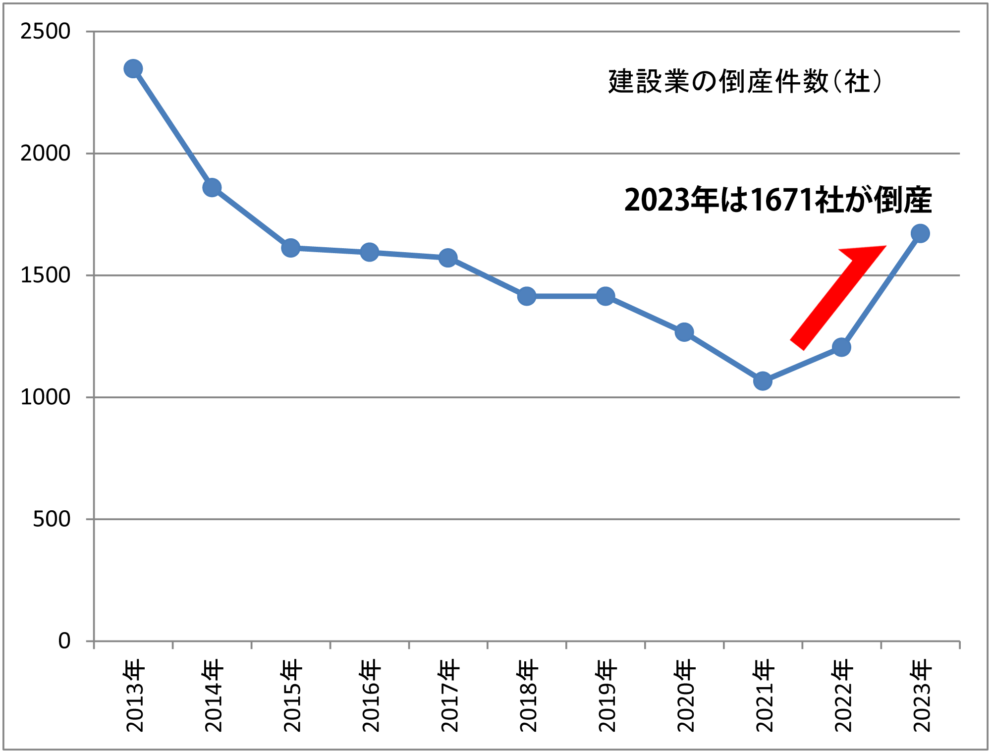 2022年度から、建設業の倒産件数が増加に転じました。2022年1204社、2023年1671社が倒産しました。とても残念な事ですが、知り合いの工務店2社も2023年の数値に含まれています。