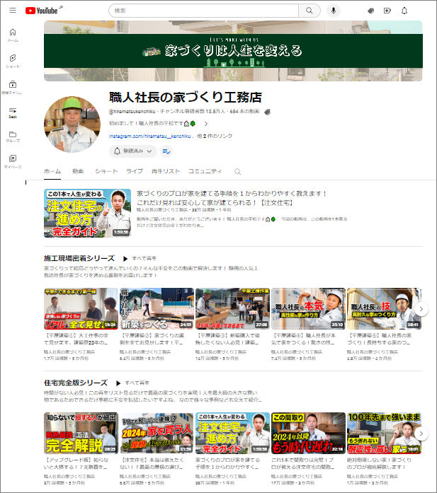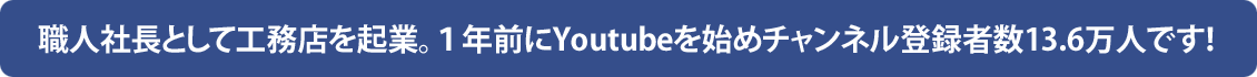 職人社長として12年前に工務店を起業。1年前にYoutubeを始めたとこころ人気を博しチャンネル登録者数が一気に10万人を突破し現在13.5万人です! チャンネル登録者数が5万人を超えたころから、全国から家を建ててほしいというメッセージが沢山届くようになっています。